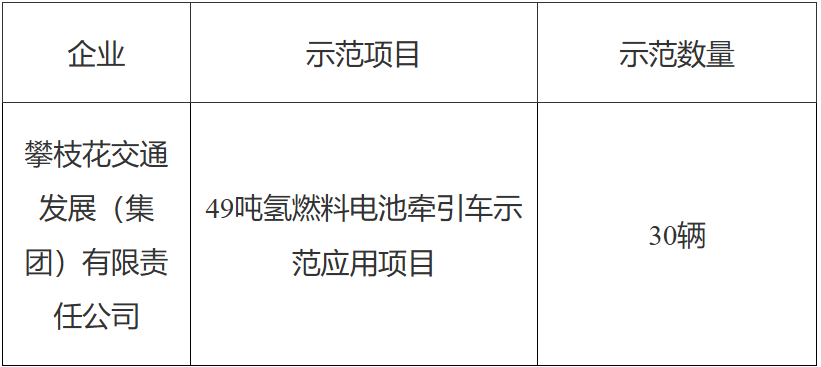 关于攀枝花市氢燃料电池汽车示范奖励通过评审项目清单的公示