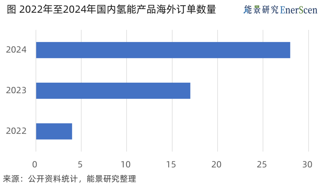 近2年,国内氢能企业的海外布局显著增多,比如2024年国内氢能产品出口订单数量(例)增长了64%左右。