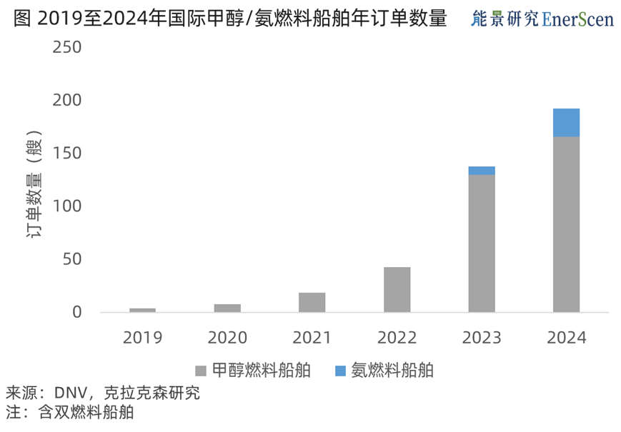 受此驱动,国际上氢基能源类型船舶订单持续增加。据挪威船级社统计,2024年全球甲醇船舶订造订单达到166艘,同比增长4%;氨燃料船舶订单开始批量出现,2024年达到27艘。