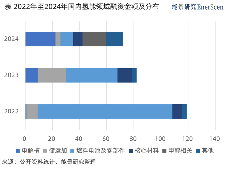 一是关注的环节在变化。比如2024年,制氢领域超过了燃料电池,首次成为融资最多的领域。电解槽相关的融资总额同比增长约137%,占2024年氢能领域投融资总额的31%。
